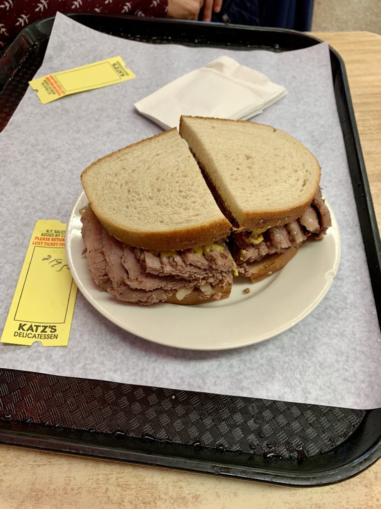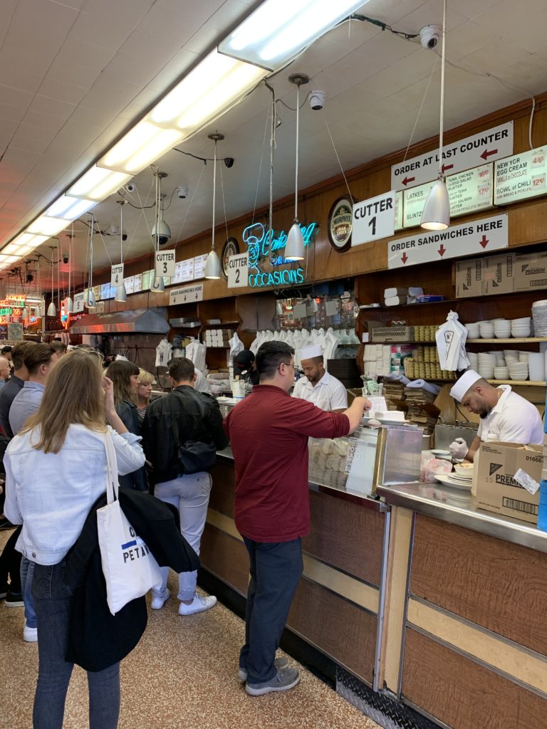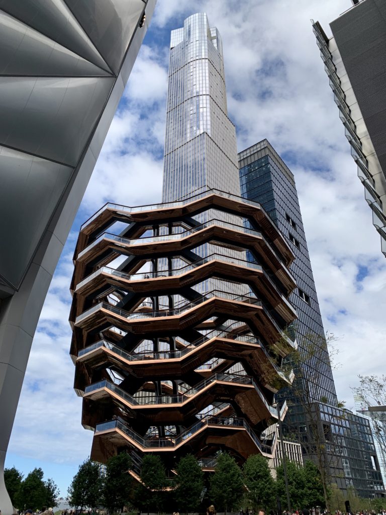 Mit der Metro gings weiter zum Katz-Deli. Ein 1888 gegründeter Fleischerladen, der für seine sehr guten Sandwiches bekannt ist. Nach einem Blick auf den Preis und die Menge das Fleisches auf dem Brot, entschieden wir uns, erstmal mit einem Sandwich für uns beide zu beginnen. Die Wahl fiel auf ein Brisket-Sandwich. Wir sind beide davon satt geworden und der Geschmack war ausgezeichnet. Beim nächsten Mal werden wir wohl das berühmte Pastrami-Sandwich probieren. Weiter gings mit der Metro in Richtung 34St. Am Madison-Square-Garden vorbei zum noch im Bau befindlichen neuen Hudson-Yards. Große Attraktion ist hier das 2019 fertiggestellte Vessel. Eine riesige, wabenähnliche Schüssel, die man erklimmen kann.
